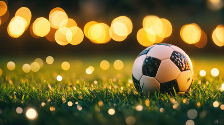 A soccer ball rests in the goal net, with the setting sun creating a warm glow in the background.