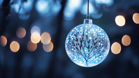 Blue Christmas decoration hanging on a tree branch with bokeh background
