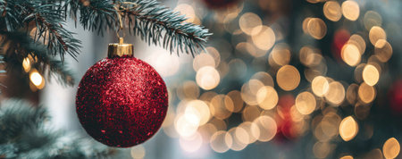 A close-up captures a bright red Christmas ornament suspended from a green evergreen branch. The scene features a shallow depth of field, with soft, out-of-focus lights creating a warm, festive bokeh. This image is suitable for a wide variety of commercial applications, including seasonal advertising.