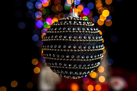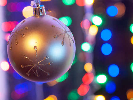 Colorful Christmas ball isolated on blurred and shiny background of lights. Christmas baubles isolated.