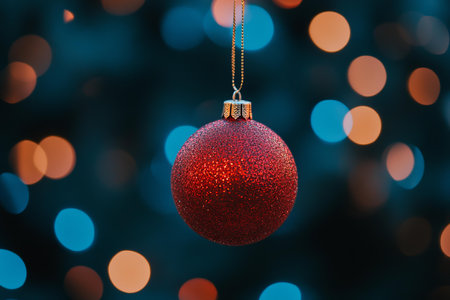 A stunning close-up of a traditional Christmas ornament with a sparkling red finish, set against a vibrant bokeh background of festive lights.