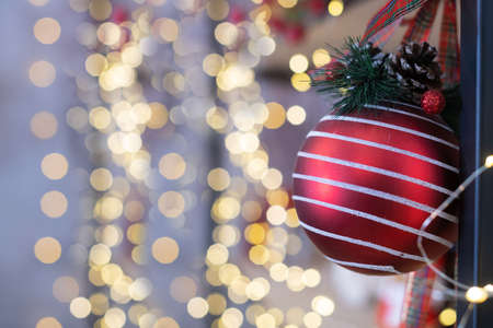 Christmas and New year holiday decoration ornament red ball with pine cones and light garland bokeh at background