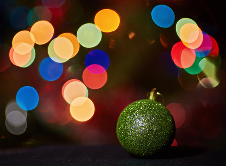 Close up of a green Christmas ball with bokeh background.