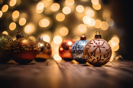 Generative AI : Close up of balls on christmas tree Bokeh garlands in the background New Year concept