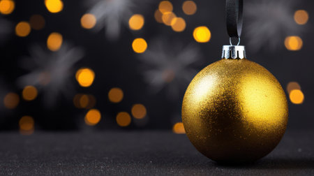 Golden christmas ball on black background with bokeh defocused lights