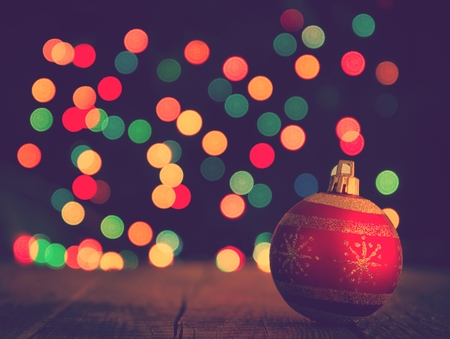 one red Christmas ornament on a wooden table, against a background of defocus lights