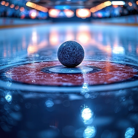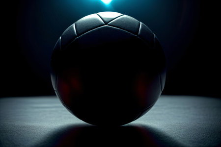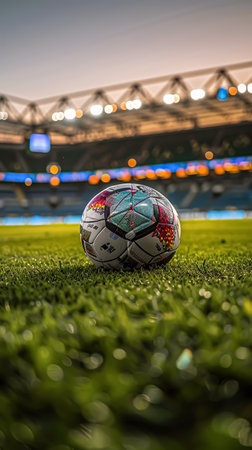 An AI generated illustration of a soccer ball in the field illuminated by stadium lights