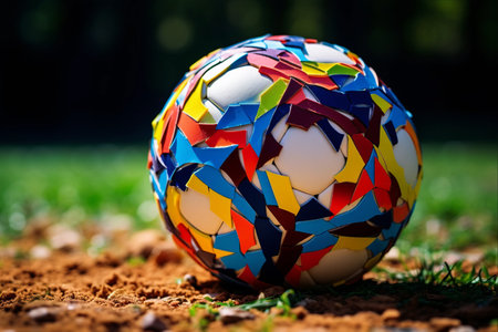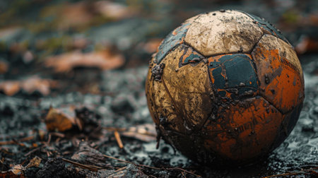 Detailed close-up of an old, worn soccer ball, highlighting the faded colors and scratches, captured on a muddy field background.