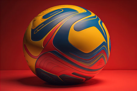 Sepak Takraw ball on a playground surface, with colorful, abstract designs in the background.