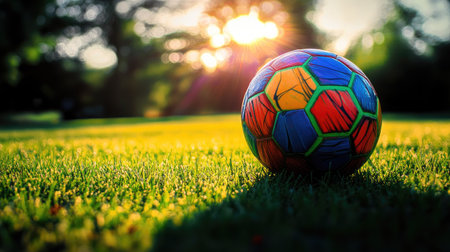 Colorful soccer ball on a grassy field during sunset, casting long shadows and highlighting the ball's vibrant colors against the green.
