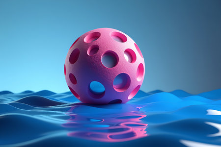A pink perforated sphere rests on a blue wavy water surface with reflections.