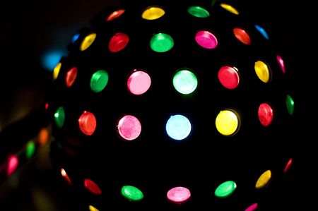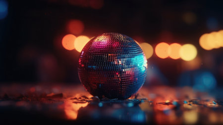 Disco ball with sparkling reflections. Close-up shot with colorful bokeh background.