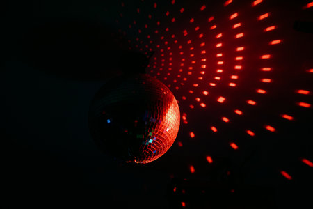 Close up of a red disco ball in a club.Disco ball in club lighting up the room.Disco ball diffuses red light in a dark room