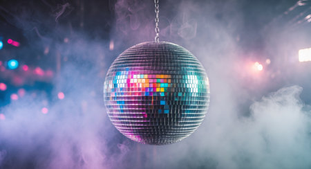 Bright light reflects off a glittering disco ball, surrounded by a captivating blend of colors that enhance the energetic vibe during a dark disco and italo disco mix night environment.