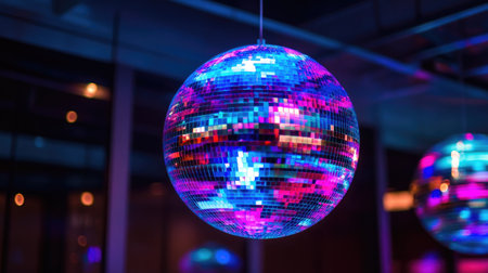 A dazzling disco ball hangs in mid-air, reflecting a kaleidoscope of pink and blue lights that create a festive atmosphere. This captivating image evokes feelings of joy and celebration, perfect for parties and nightlife.