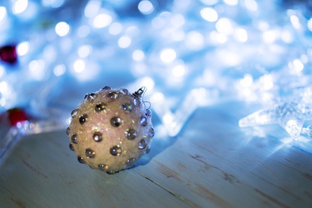 Close up of sparkling Christmas lights with Christmas ornament on the wooden table