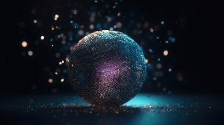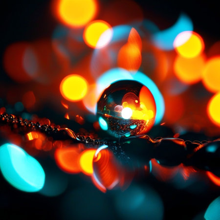 Delicate orb rests on sleek, dark surface, reflecting spectacular array of colorful bokeh lights. Blurred, radiant lights in background. Beauty of light and reflection in artistic arrangement. AI