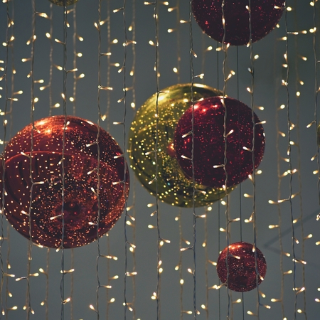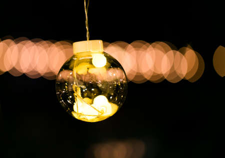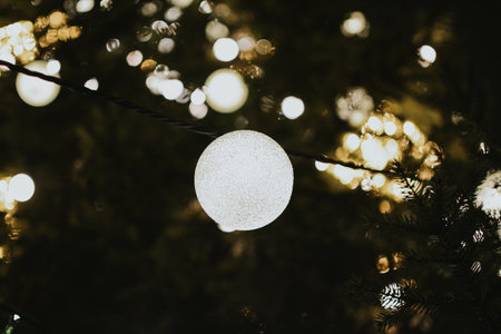 Christmas tree with Decorative lights and mirror ball on blurred background.
