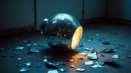 Broken disco ball with shattered glass reflecting light, symbolizing loss and celebration