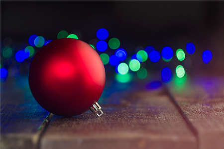 one red Christmas ornament on a wooden table, against a background of defocus lights