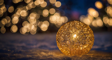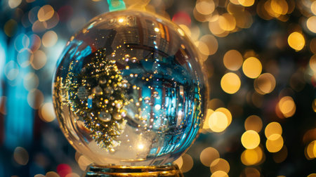 A magical close-up of a Christmas ornament reflecting warm bokeh lights in the background. The festive and cozy atmosphere is perfect for themes related to holidays, celebration, and winter decorations.