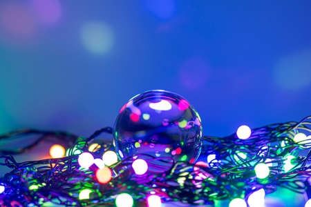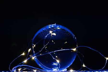 Glass ball and Christmas garland on blue background, concept picture for New Year and Christmas holidays, space for text
