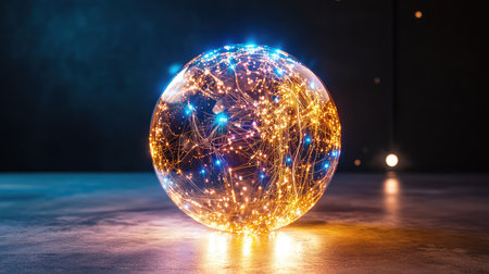 An otherworldly floating sphere made of semi-transparent material, featuring glowing neon blue veins, created by ai