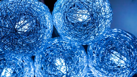 peace of blue modern art luxury chandelier made with balls with lamp inside every one, which connet to beautiful flower. Lighting ball hanging from the ceiling on the dark background