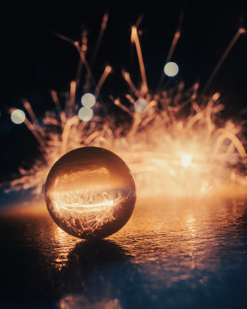 A transparent ball on the wet ground surface reflecting the bright firework in the background