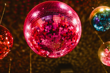 A pink disco ball is hanging from the ceiling. There are other disco balls in the background. The disco balls are all different colors