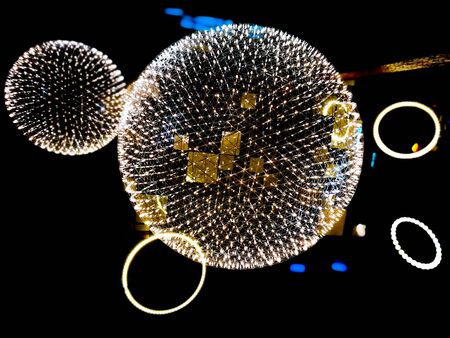 Mirrored Disco Ball and bright beams at the night party. Party attribute reflects Lazer lights. Abstract background with defocused rays. Night club atmosphere. Installation at Vilnius light festival