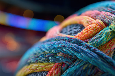 Colorful braided rope close-up reveals intricate weaving pattern, showing vibrant hues of blue, orange, and yellow. Background blurred with circular light effects adding depth