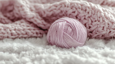 A soft pink yarn ball sits gracefully next to a cozy knit blanket on a plush surface, perfect for crafting and creating a warm, inviting atmosphere.