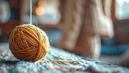 A single ball of golden yarn rests on a rustic surface, bathed in the warm, gentle glow of morning sunlight.