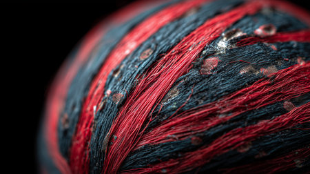 Close-up view of textured yarn with red and black colors showing detail and fibers