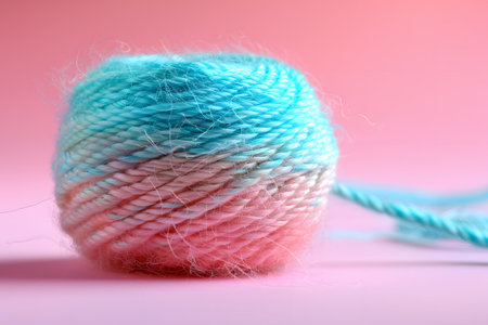 Gradient ball of yarn featuring pastel blue and pink hues, set against a softly contrasting pink background. ideal for knitting, crocheting, and other yarn crafting projects, this vibrant yarn is perfect for adding a touch of color to your handiwork. Generative AI