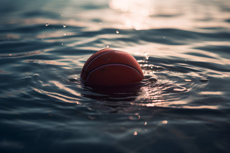 Small orange basketball lies on synthetic green grass with white markings on a football field. Sports games outside at sunny day. Sport equipment, recreation, activity, game, training. Space for text.