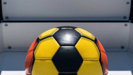 A close-up of a colorful soccer ball on the pitch during an evening match at a stadium filled with enthusiastic fans. Generative AI