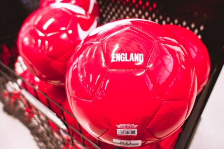 BURNHAM, UK - APRIL 19 2015: Red Nike branded footballs for sale in a UK store.