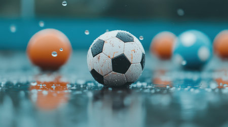 A close-up of a soccer ball on a rainy surface with colorful balls in the background. Water droplets create a vibrant, dynamic scene perfect for sports and activities.