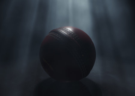 A generic red cricket sports ball being lit by a single ethereal light rays on a dark black background - 3D render
