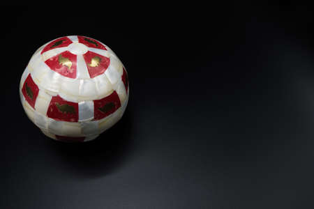 Christmas wallpaper background of marbled red and white ball with golden paint isolated on black background. Copy space.