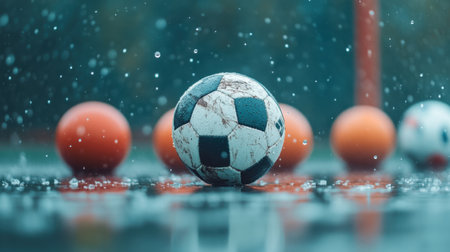 A soccer ball sits on a wet surface with raindrops splashing around, creating a dynamic scene perfect for capturing the essence of outdoor sports and activities.