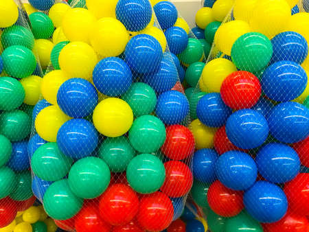 Top view of many colorful plastic balls on water. View of colored sponge balls. Many colorful balls as background. Lots of colorful balls for children to play in the water park. Toy pool for kids.