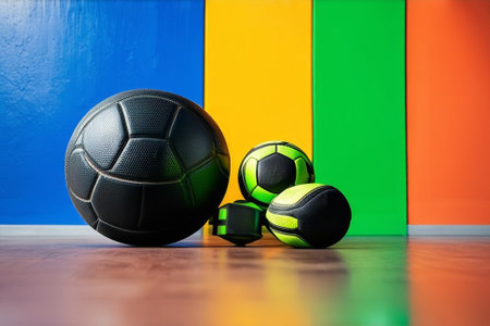 Black Basketball and football balls against colorful walls. Sport equipment lying on the floor. Sporty banner background with copy space