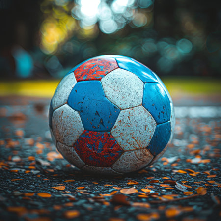 Close-up of an old, worn-out soccer ball, partially deflated, lying on the street with a colorful fall leaves in the background. Retro and vintage sports equipment from the 90s.@240804_