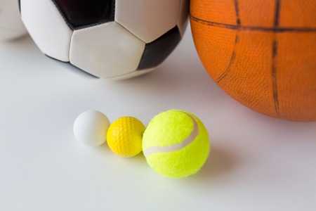 sport, fitness, game, sports equipment and objects concept - close up of different sports balls set