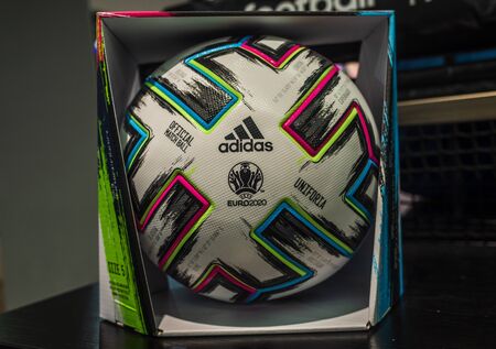10 November 2019 London, United Kingdom. The official ball of the European football Championship 2020 Adidas Uniforia Competition in the sports shop window.