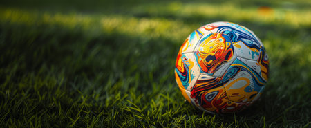 Banner. Brightly colored football with abstract, graffiti-style design sits on lush, green grass stadium.