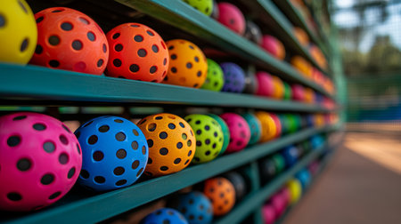 Vibrant pickleball balls with colorful dots displayed on an outdoor sports court shelf